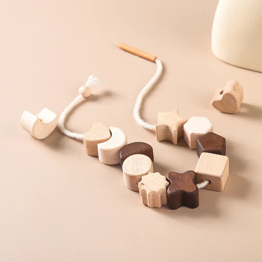 Deze set bevat 10 verschillende houten rijgkralen en wordt geleverd inclusief rijgtouw met houten naald en opbergzakje. Perfect om spelenderwijs vormherkenning, oog-handcoördinatie, concentratie en creativiteit te stimuleren.