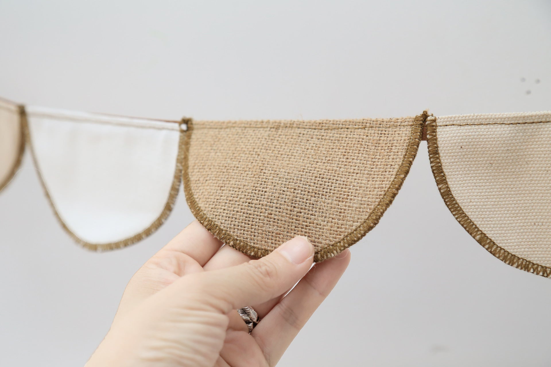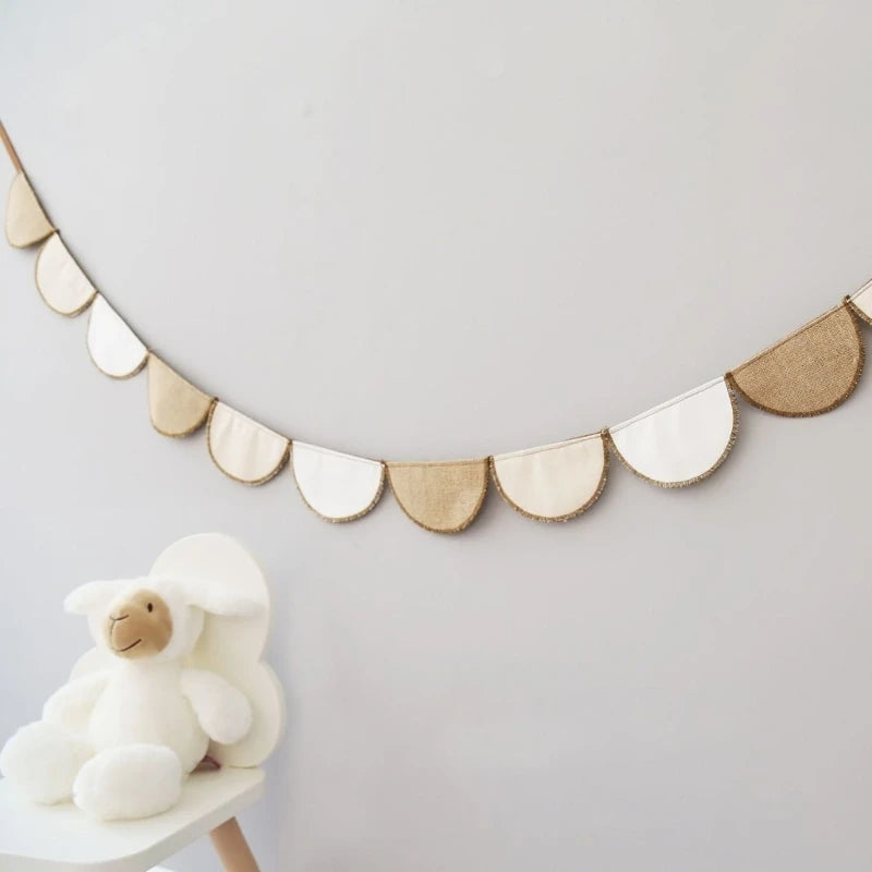 Voeg een subtiele en stijlvolle touch toe aan de kinderkamer, speelhoek of babykamer met deze prachtige katoenen vlaggenlijn in neutrale kleuren. De halve cirkelvormige vlaggetjes wisselen af in zachte crème- en zandtinten en zijn afgewerkt met een fijne stikrand voor een natuurlijke, rustgevende uitstraling.